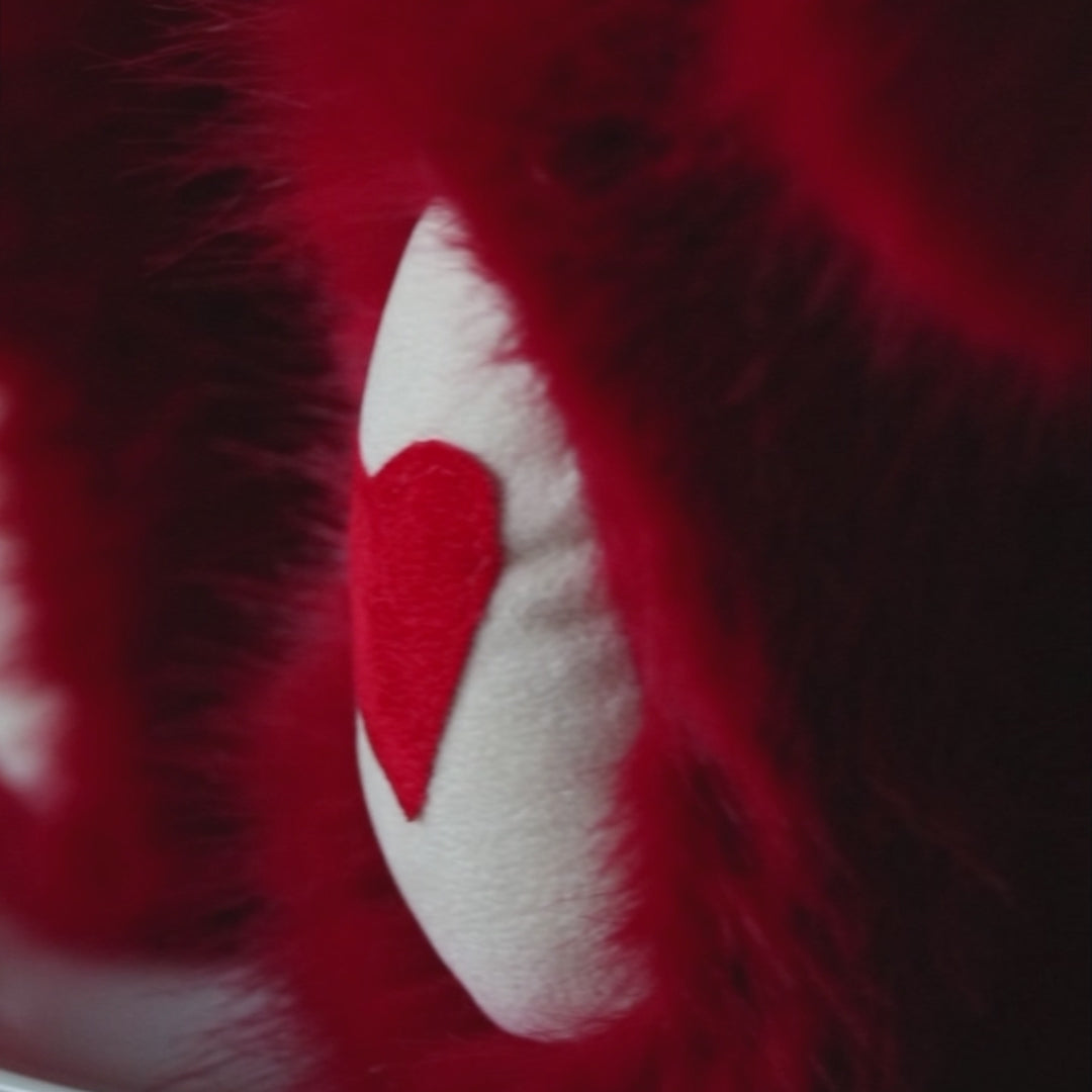 To compliment her red fur she has soft cream ultra-suede pads and paws, with a red love heart carefully stitched onto one footpad. Amore is complete with a red sheer organza ribbon edged with satin.