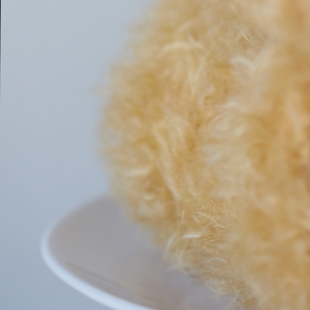 Made from 100% pure golden curly mohair with soft fawn ultra-suede pads and paws. He has shiny black safety-locking eyes and a black hand embroidered nose, which lends him an endearing expression. Gregory is fully jointed with our own hand-stamped wooden joints and is soft filled with recyclable materials. To complete this bear’s traditional appearance, he wears a double-sided red satin bow around his neck and has a weighted bag in his tummy that gives him a lovely tactile feel.